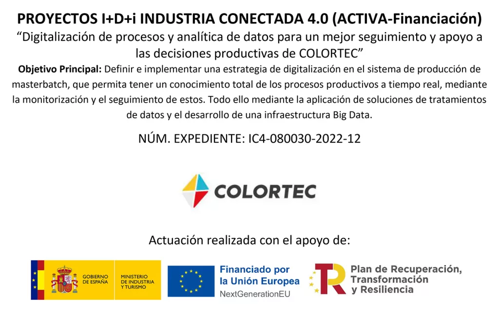 Ver proyecto I+DEn COLORTEC, estamos comprometidos con la innovación y la mejora continua. Por ello, hemos implementado un ambicioso proyecto de digitalización en nuestro proceso de producción de masterbatch, destinado a optimizar la eficiencia, garantizar la trazabilidad y reforzar la calidad de nuestros productos.